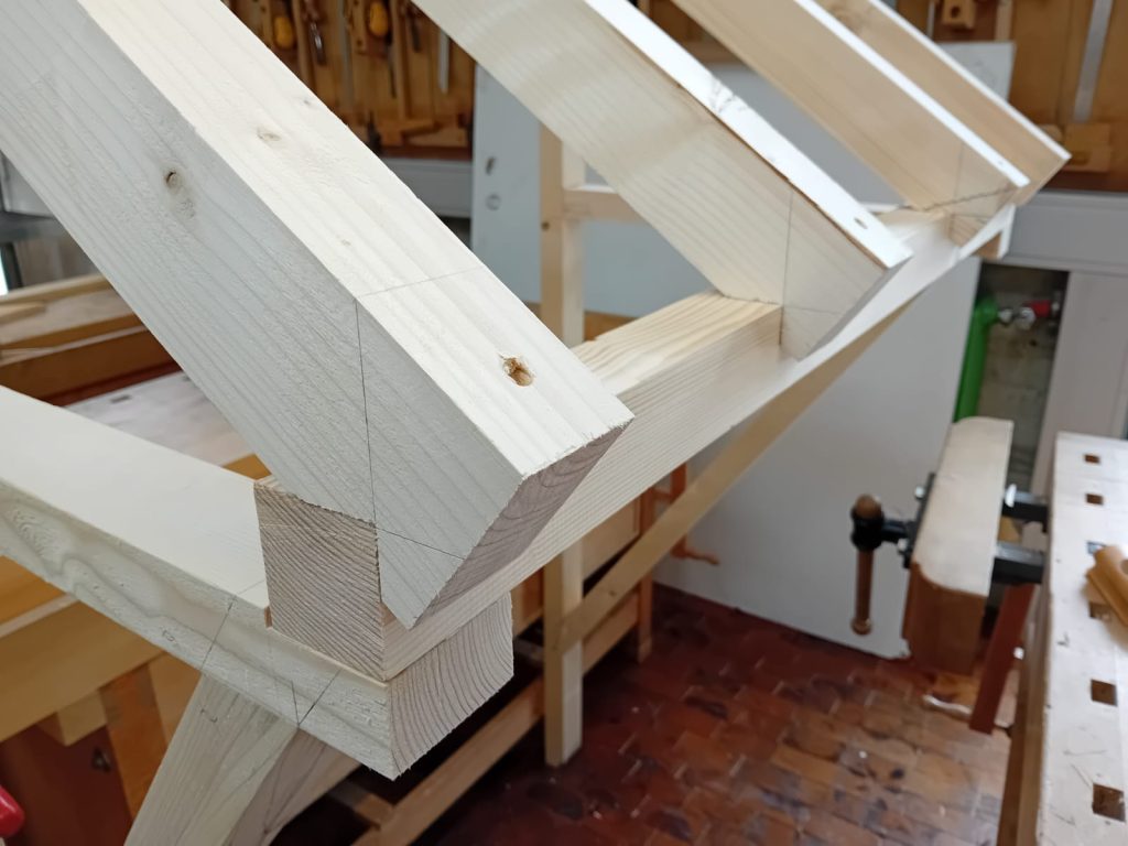 Du arbeitest zusammen mit Zimmererlehrlingen des 1. Ausbildungsjahres (BGJ) Teile eines Dachstuhls aus. Wir zeigen dir das Anreißen und das Ausarbeiten der Werkstücke. Am Ende wird dann der "Modelldachstuhl" von dir unter Anleitung zusammengebaut.